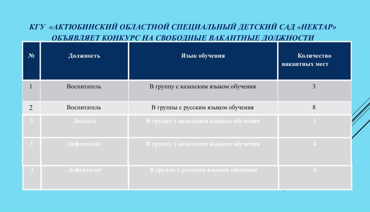 4 штатных единиц учитель-дефектолог с казахским языком обучения;